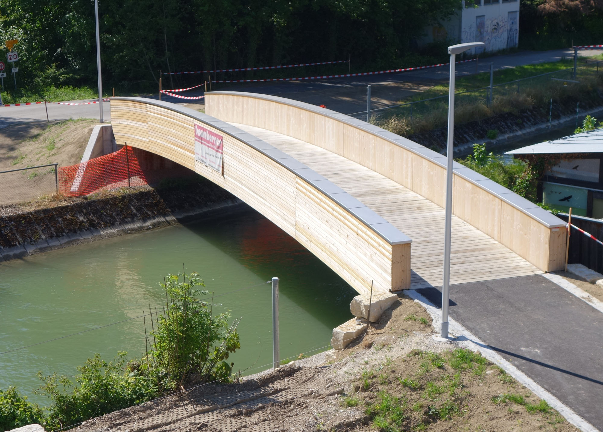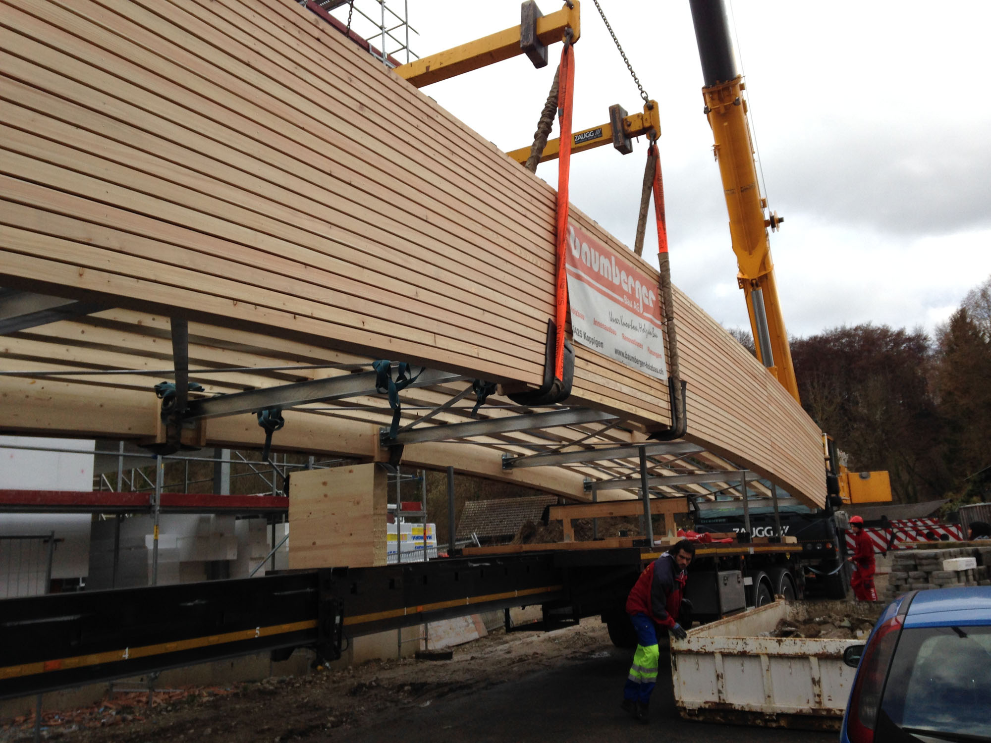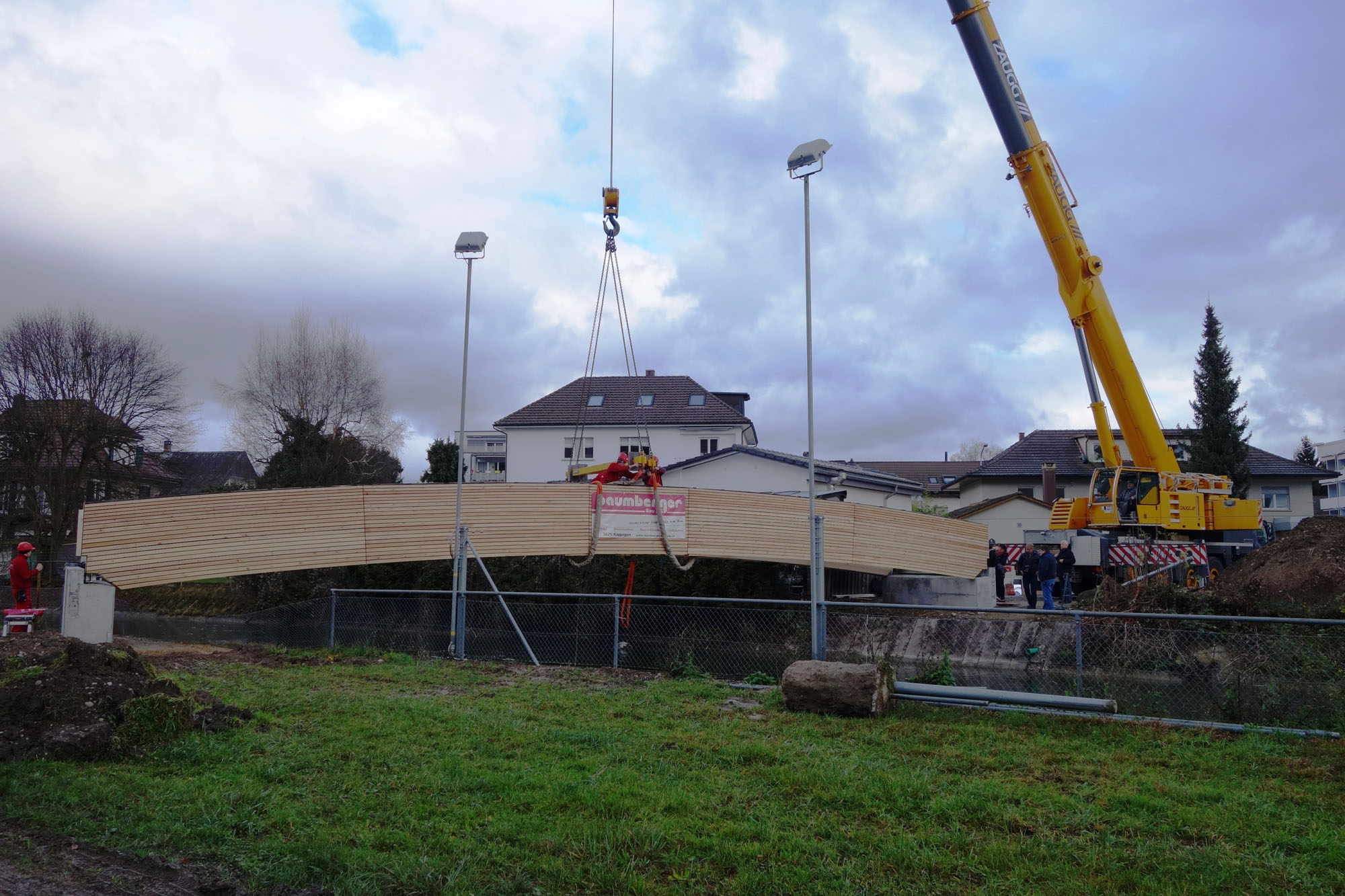 Knapp 10 Tonnen Holz haben wir während der Vorfertigung und Montage durch für den Bau der 22 Meter langen Kanalbrücke in Derendingen verbaut. Am 9. Dezember 2014 hatten wir den Termin, die wichtige Verbindung über den Emmenkanal in Derendingen mittels eines Pneukrans zu montieren. Die insgesamt 12 Tonnen schwere Brücke wurde in einem Stück transportiert und montiert. Gekonnt manövrierte der Chauffeur seinen LKW mit der Holzbrücke in die enge Strasse. Kurze Zeit später schon wurde die Brücke durch den Pneukran angehoben und schwebte über den Köpfen der Zuschauer durch die Luft Richtung Kanal zu. Mit nur einem Hub und millimetergenauster Arbeit lag sie keine halbe Stunde später auch schon perfekt platziert auf den beiden vorbereiteten Betonsockeln und konnte durch das Montage-Team der Baumberger Bau AG fixiert werden.