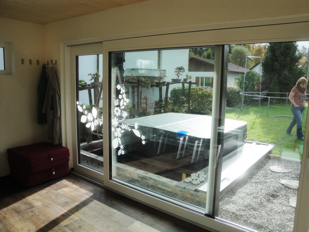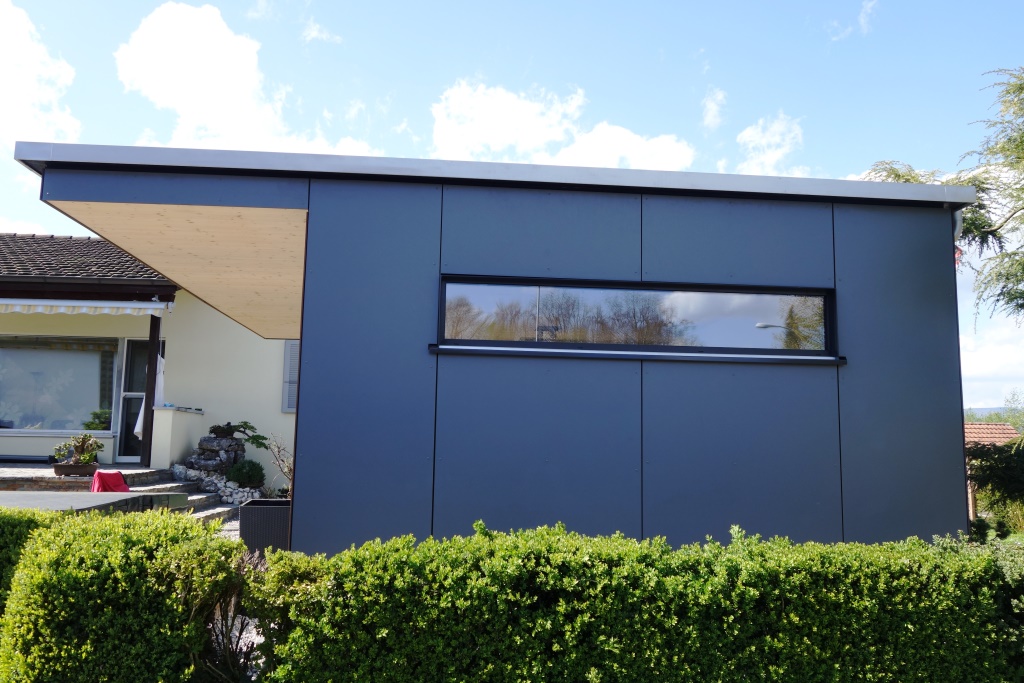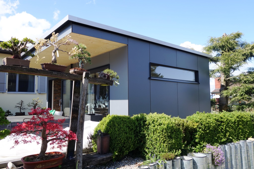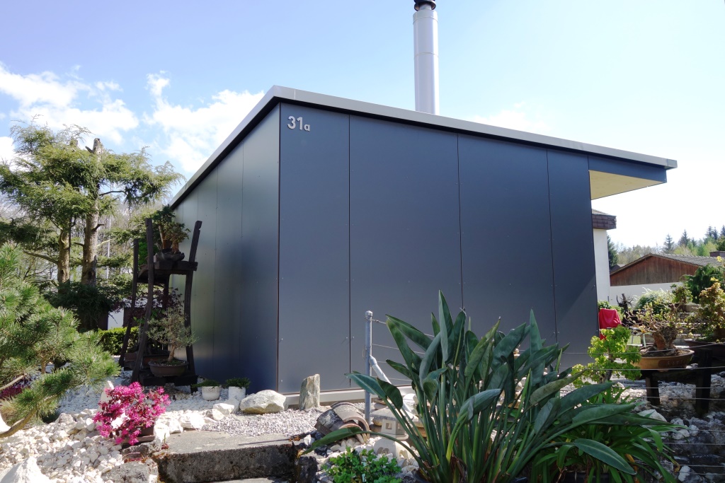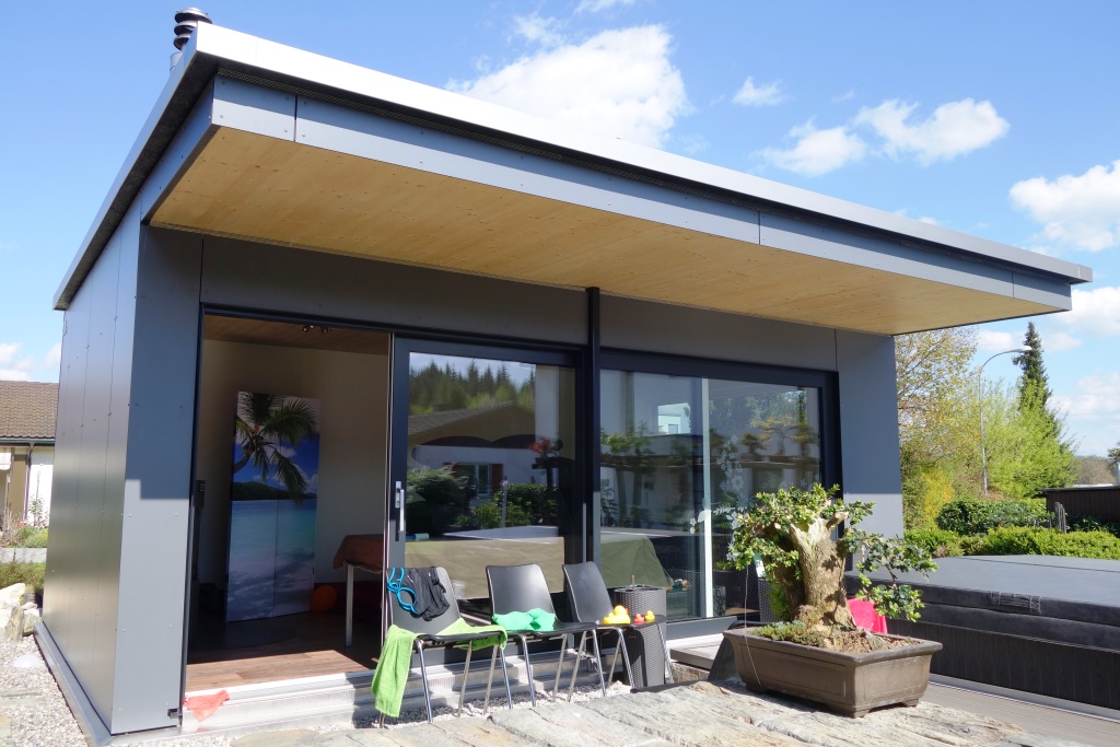 Dieser Gartenpavillon ist mit einem Holzofen im Winter beheizbar und so auch an kalten Tagen sehr gut nutzbar. Im Sommer bietet das stark auskragende Vordach optimale Beschattung für den Innenraum.