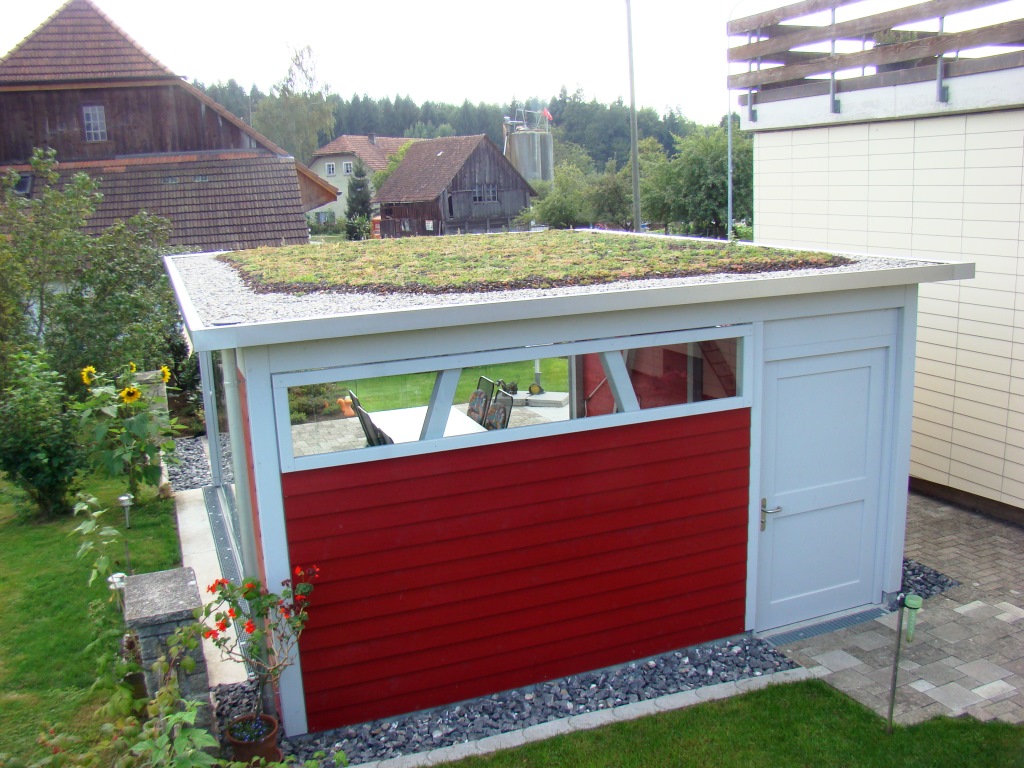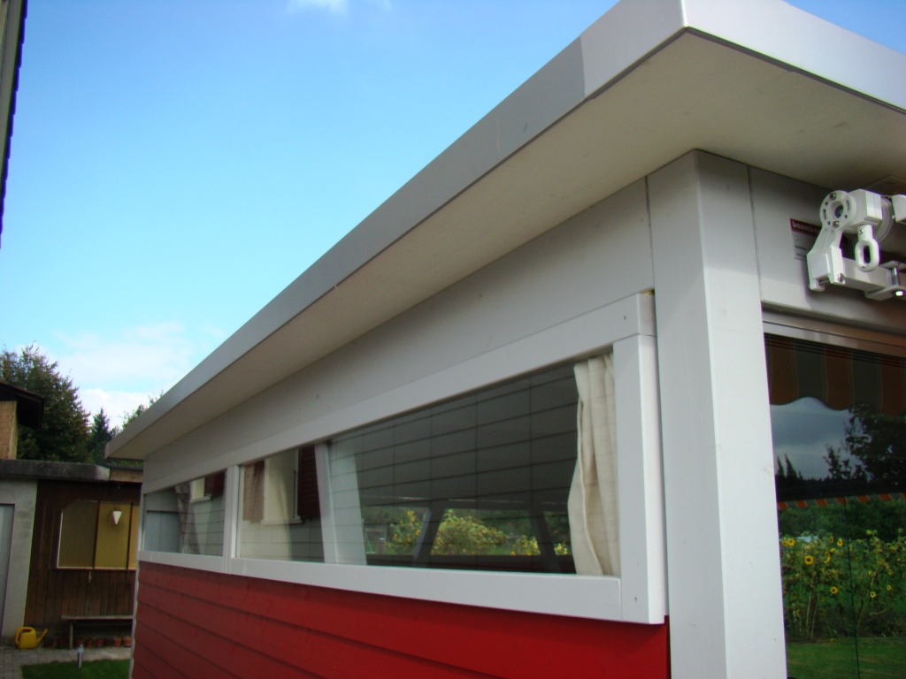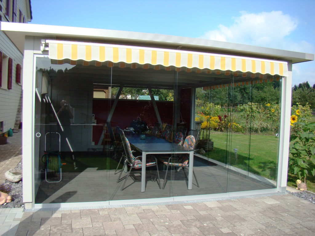 Mit diesem grosszügigen Gartensitzplatz haben die Bauherren eine gemütliche Oase geschaffen. Die Verglasung kann je nach Wunsch durch Verschieben ganz geöffnet werden.