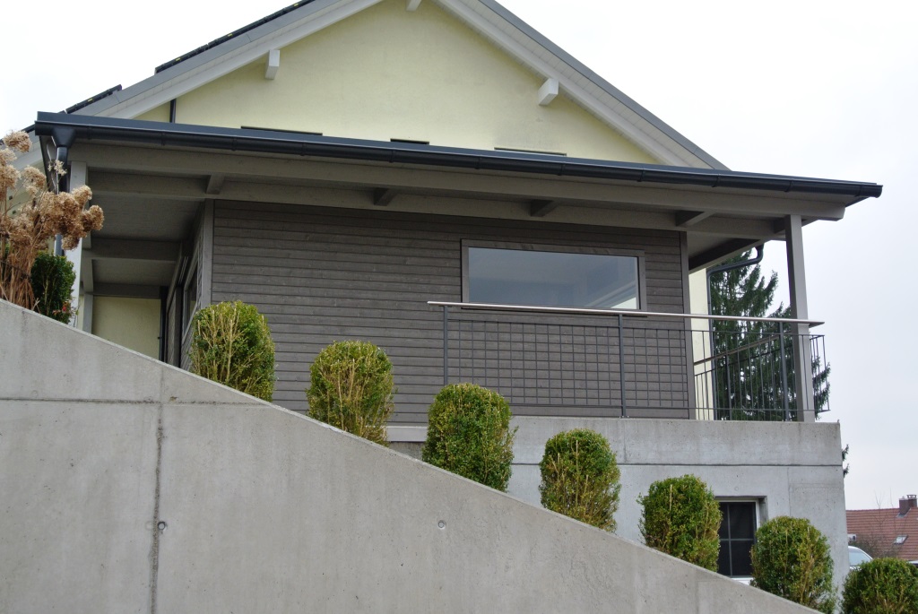 Auf die bestehende Garage haben wir einen grosszügigen Geräteraum geplant. Durch eine abschliessbare Schiebetüre optimal zur Lagerung der Gartengeräte und dank des rundherum verlaufenden Vordaches ist die Fassade optimal vor Witterungseinflüssen geschützt.